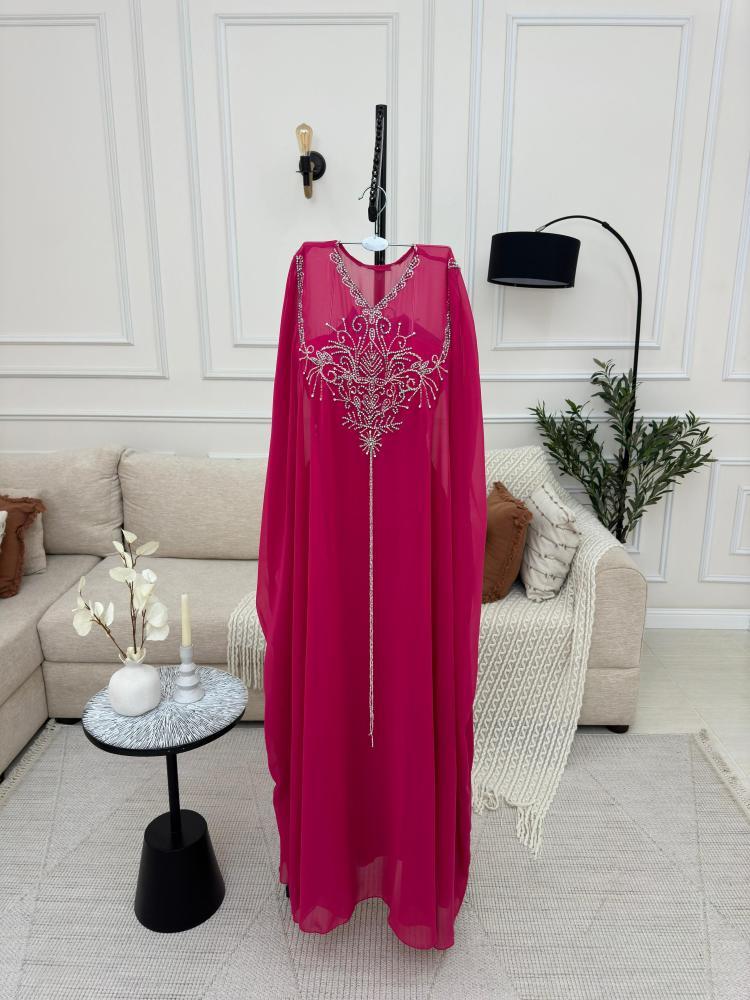 فستان فاخر بتصميم يعكس الإبداع والأنوثة المميزة، مصنوع من جورجيت على بطانة تفتة والقماش الشيفون الكوري الفخم الذي ينساب بانسيابية على القوام. يتميز الفستان بأكمام أنيقة وتفاصيل جريئة